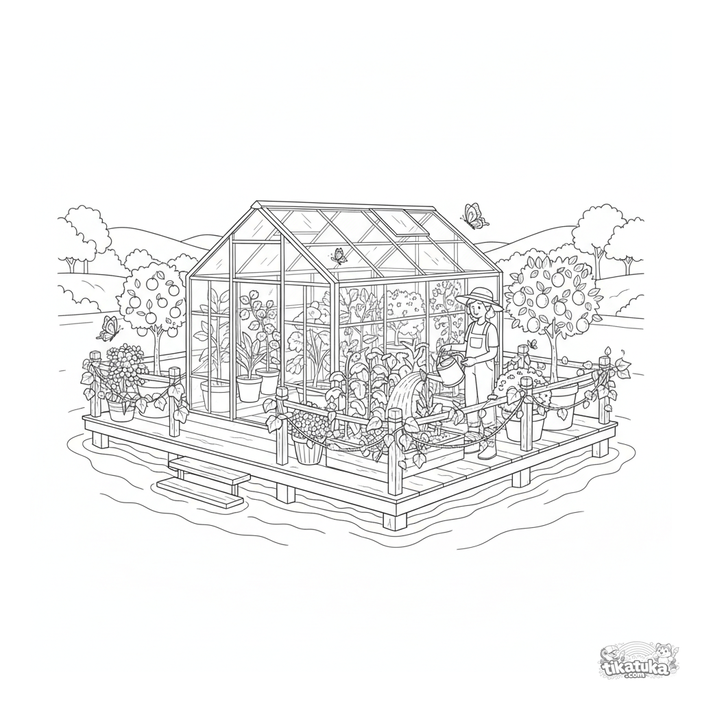 Ausmalbild für Kinder 10-12: ein detaillierter schwimmender Garten mit Gewächshaus, Hochbeeten und Topfbäumen auf einer Meeresplattform. Ein Gärtner gießt Pflanzen, Schmetterlinge flattern.