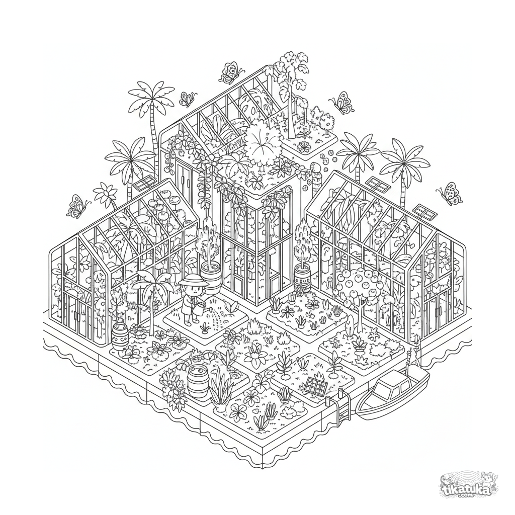 Ausmalbild für 10-12 Jahre: ein komplexes schwimmendes Gewächshaus mit exotischen Pflanzen in einem tropischen Meer. Botaniker, Glasdächer, Schmetterlinge und Sonnenkollektoren.