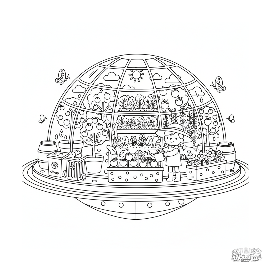 Ausmalbild für 10-12 Jahre: Ein schwimmender Gewächshausgarten auf einer runden Plattform auf dem Meer. Gemüsebeete, Topfbäume, ein Gärtner und Schmetterlinge. Eine detaillierte, grüne Szene.