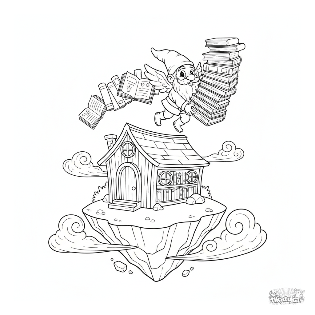Ausmalbild für Kinder 7-9: Eine schwebende Insel mit einer gemütlichen Bibliothek schwebt in den Wolken, bedient von einem geflügelten Gnomen mit alten Büchern. Eine magische Himmelsszene.