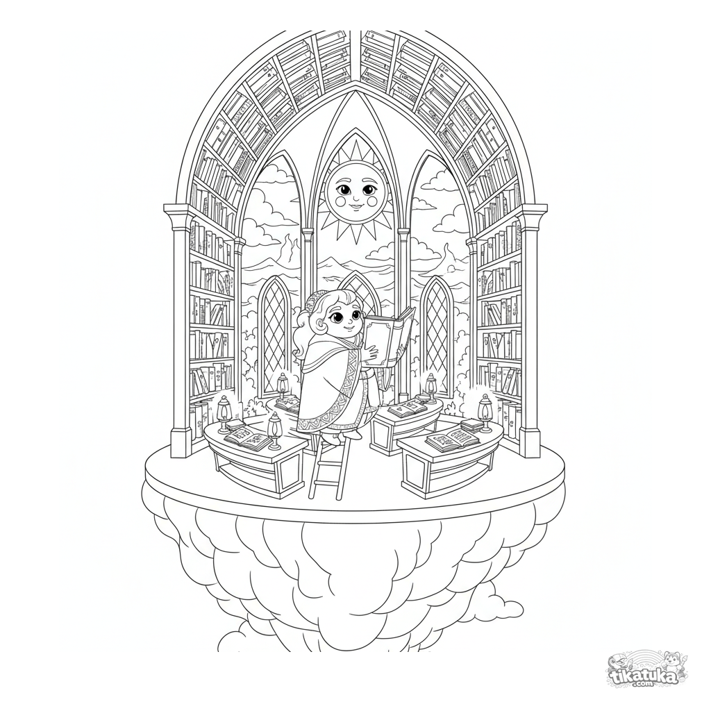 Komplexes Ausmalbild einer schwimmenden Bibliothek im mittelalterlichen illuminierten Stil für 10-12 Jahre. Details: Regale, Leiter, Schriftrollen, Lesepulte.