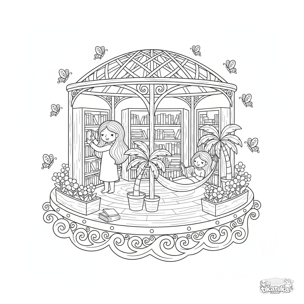 Ausmalbild für 10-12 Jahre: eine skurrile schwimmende Plattform als Bibliothek und Garten. Bücherregale, eine Hängematte, Topfpalmen und ein ruhiges Meer.
