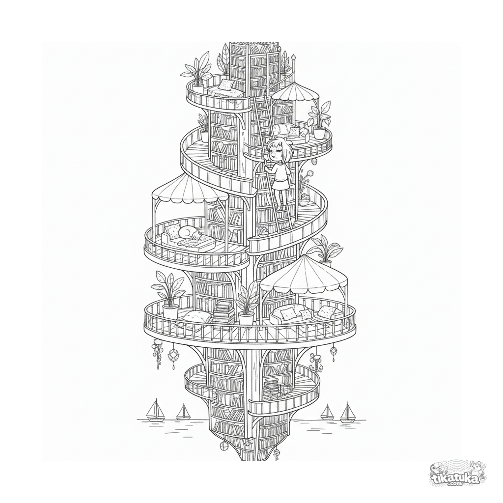 Ausmalbild für Kinder 10-12: Eine mehrstöckige schwimmende Bibliotheksplattform mit Spiralrampe, Bücherregalen und Lese-Ecken. Ein Bibliothekar auf einer Leiter, eine schlafende Katze.