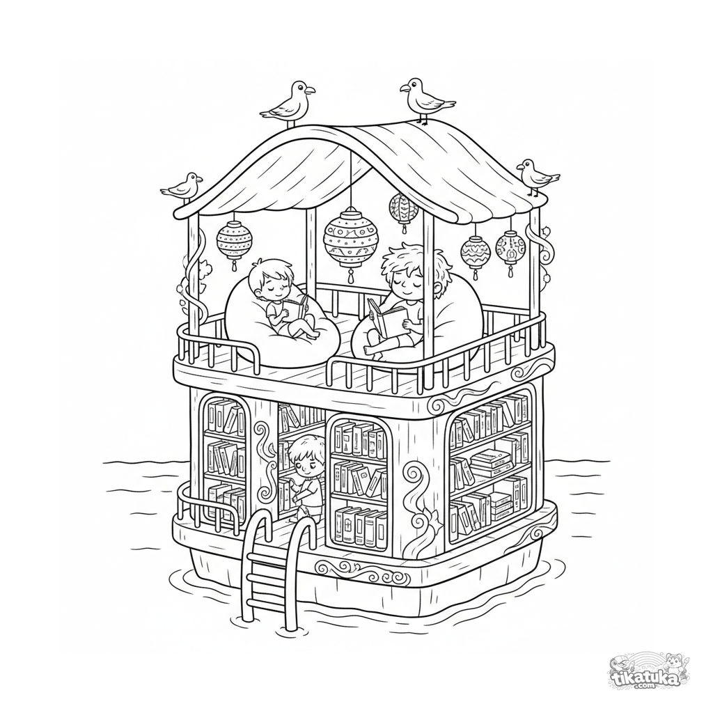Ausmalbild für 10-12 Jahre: Eine gemütliche schwimmende Bibliothek auf einer Plattform auf dem Meer. Bücherregale, eine Leseecke, Laternen und eine Leiter. Eine detaillierte, friedliche Szene.