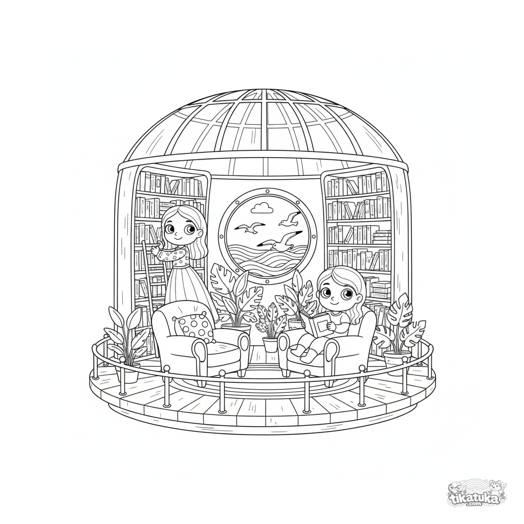 Ausmalbild: Eine gemütliche schwimmende Bibliothek auf einer runden Meeresplattform für Kinder von 10-12 Jahren. Details: Glaskuppel, Bücherregale, Lesesessel und Meerblick.