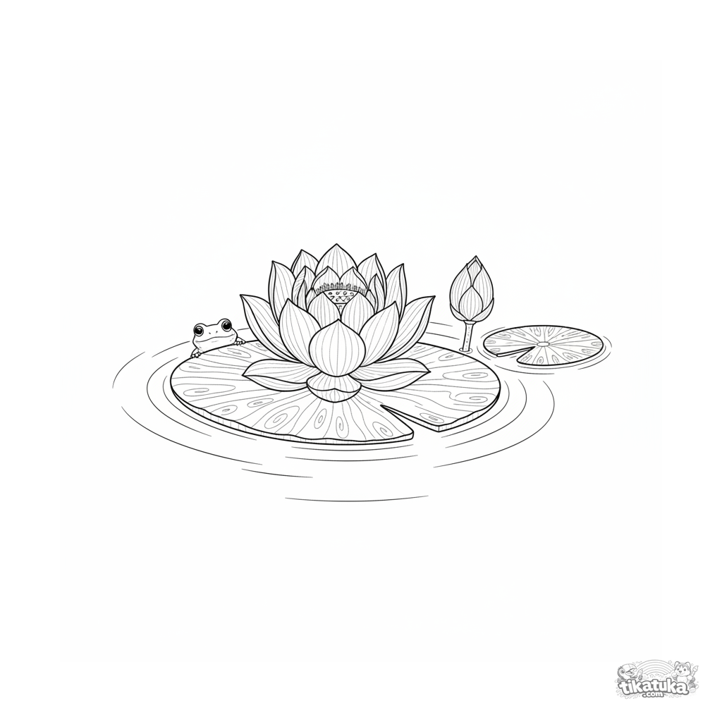 Ausmalbild für 10-12 Jahre: Eine detaillierte Lotusblüte schwimmt auf einem Teich, ein kleiner Frosch in der Nähe. Realistische Wasserszene.