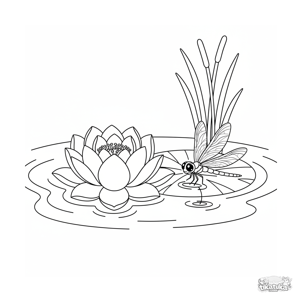 Ausmalbild für 7-9 Jahre: Eine Lotusblüte schwimmt auf einem Teich, eine Libelle landet auf ihrem Blatt. Friedliche Szene.