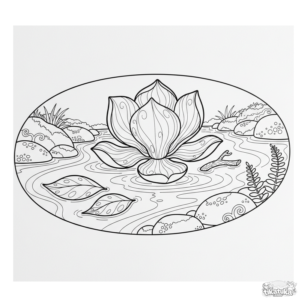 Anspruchsvolles Ausmalbild für 10-12 Jahre: eine Magnolienblüte schwebt auf einem Waldbach im Art-Nouveau-Stil.
