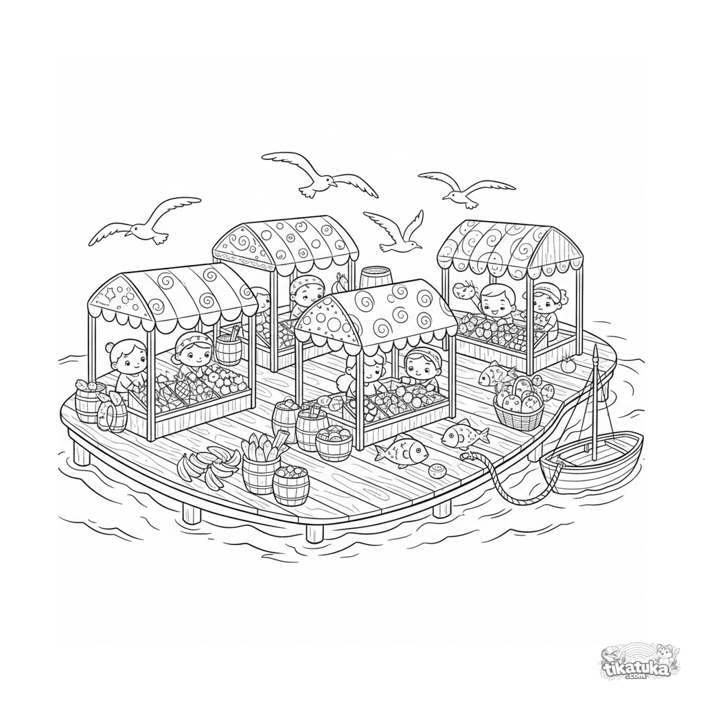 Ausmalbild einer schwimmenden Marktplattform im Meer für 10-12 Jahre. Detaillierte Szene mit Ständen, Booten und Möwen.