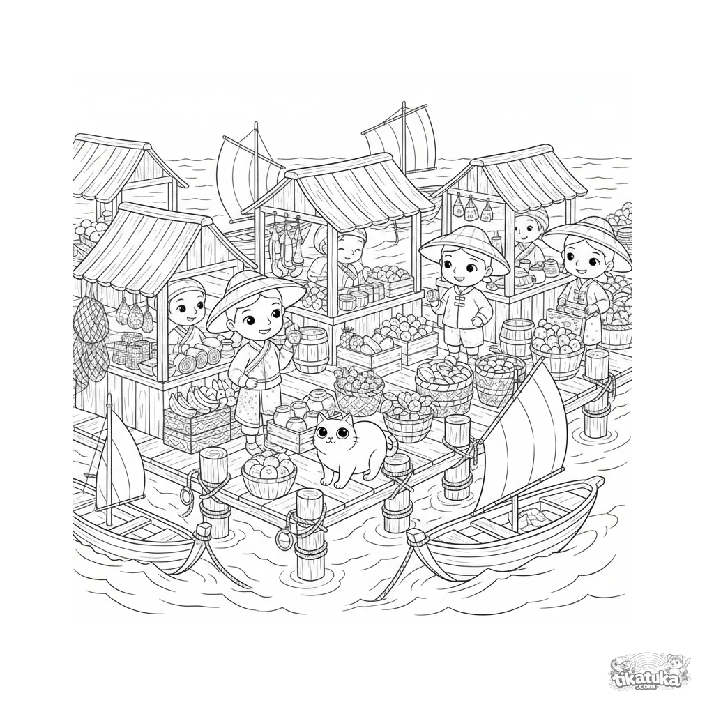 Ausmalbild einer schwimmenden Marktplattform auf dem Meer für 10-12 Jahre. Detaillierte Szene mit Ständen, Booten und Menschen mit Hüten.