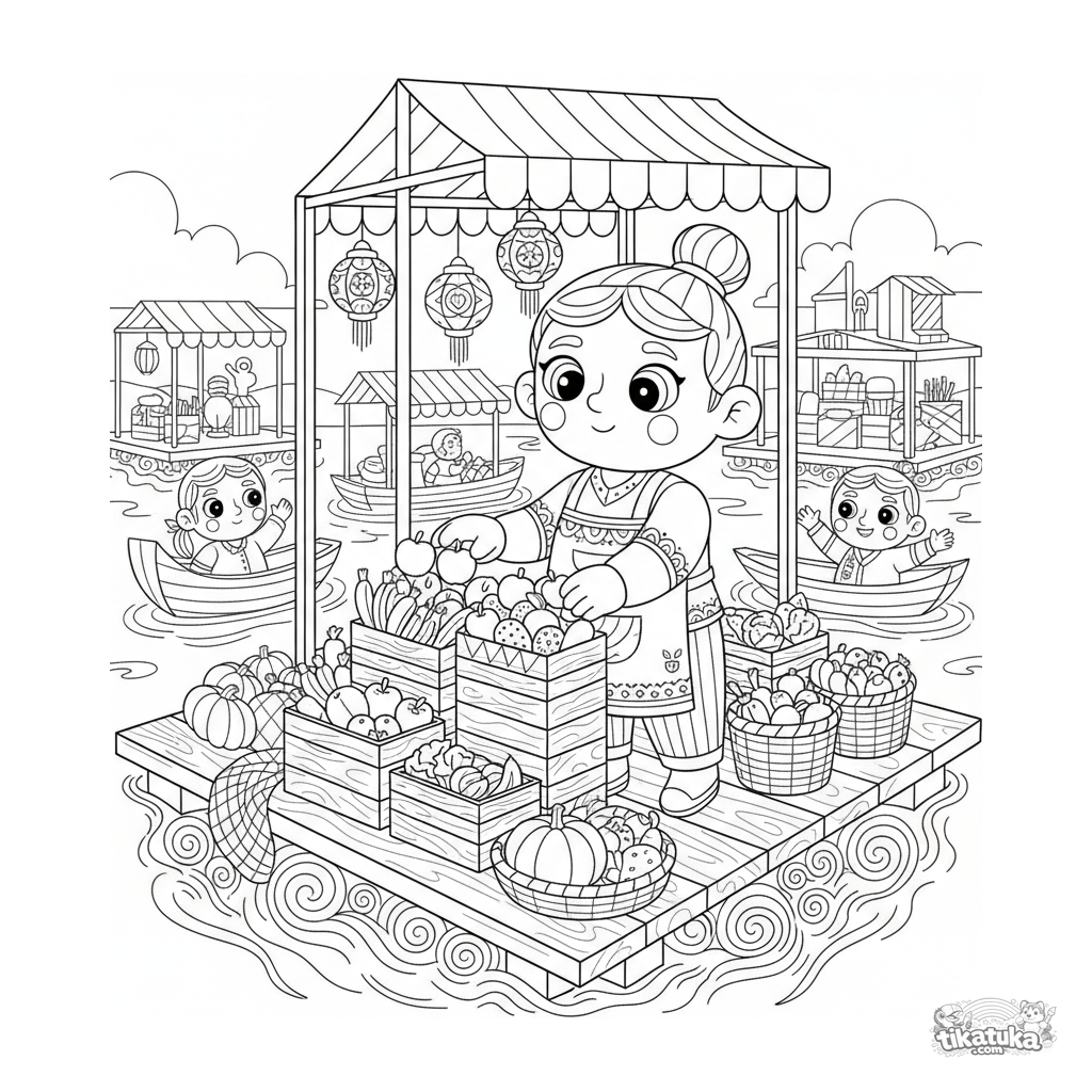 Ausmalbild für 10-12 Jahre: Ein lebhafter schwimmender Markt auf einer Meeresplattform. Detaillierte Szene mit Ständen, Markisen, Booten und Kunden.