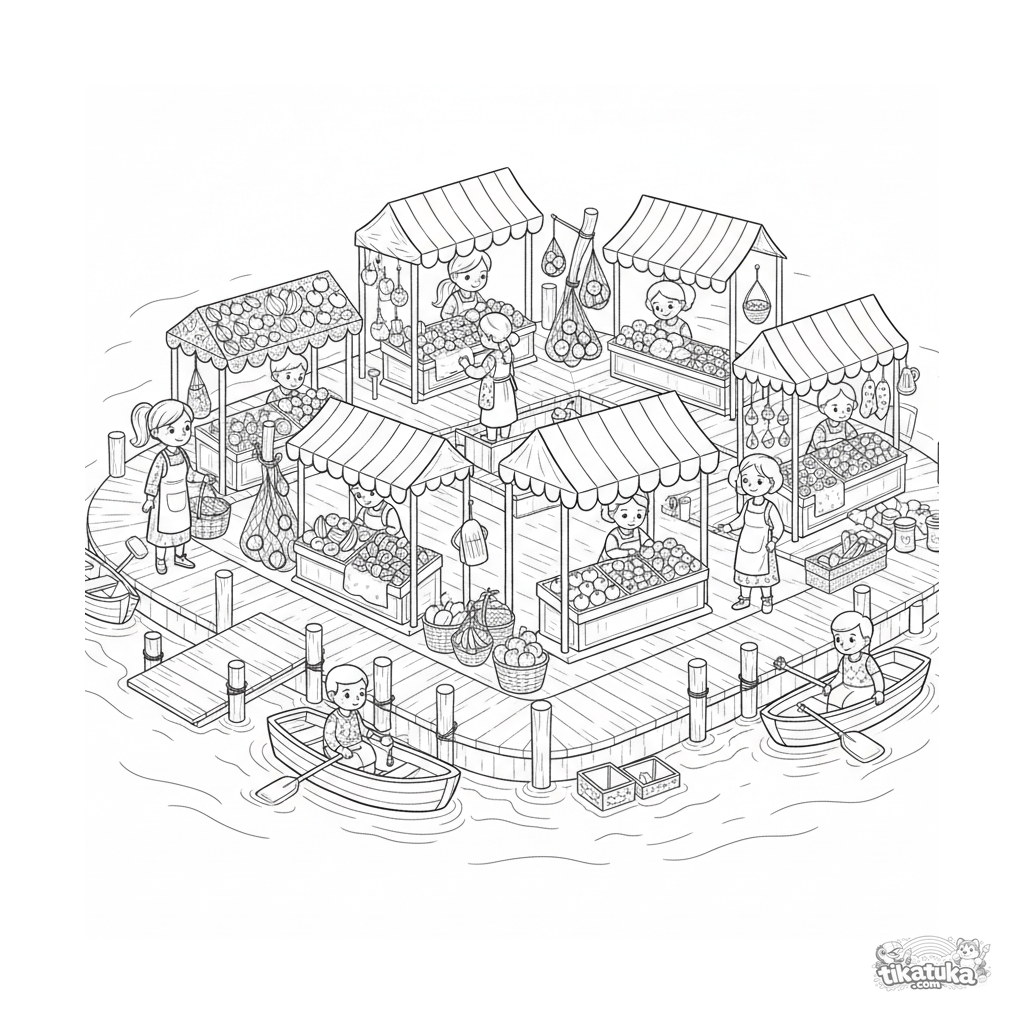 Ausmalbild für Kinder 10-12: Ein belebter schwimmender Markt auf einer großen Plattform in einer Meeresbucht. Stände mit Markisen, Händler, Kunden in Booten.