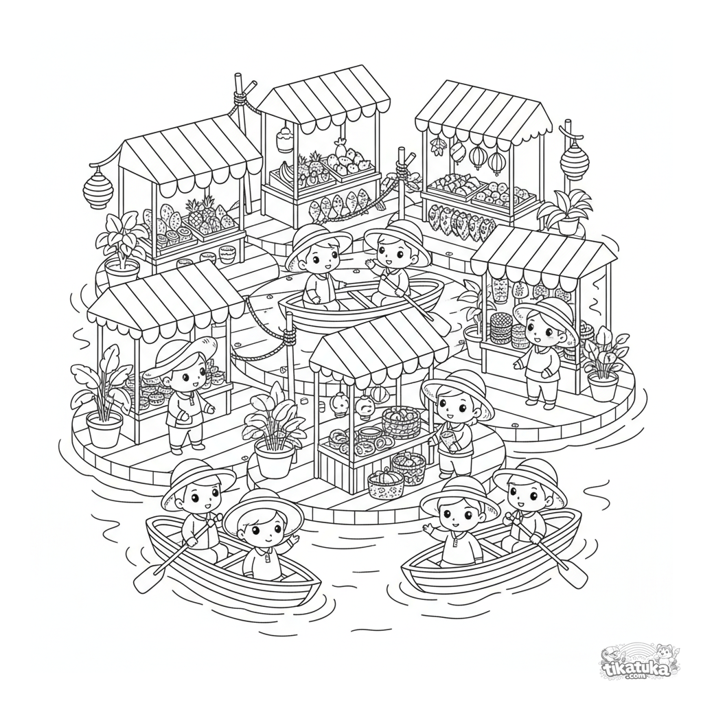 Ausmalbild für Kinder 10-12: ein geschäftiger schwimmender Markt auf Holzplattformen in einer Meeresbucht, mit Ständen, Booten und Händlern. Detaillierte Szene zum Ausmalen.