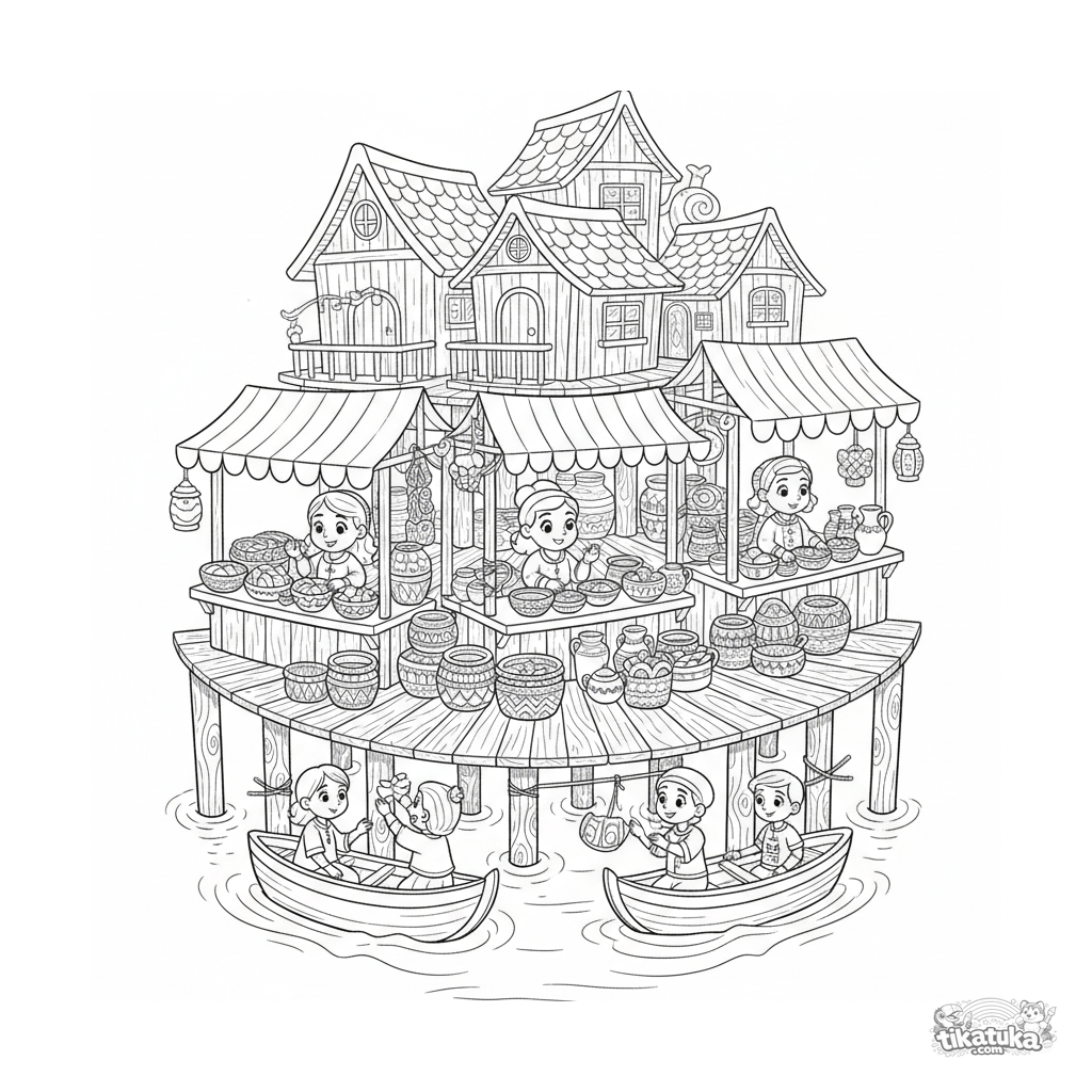 Komplexes Ausmalbild eines schwimmenden Marktes mit Stelzenhäusern für 10-12 Jahre. Viele Details: Boote, Händler, Waren.