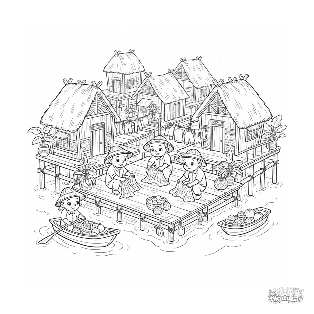 Ausmalbild für 10-12 Jahre: ein geschäftiges schwimmendes Fischerdorf auf Holzplattformen. Pfahlhäuser, Fischer, Boote und Stege in einer Meeresbucht.
