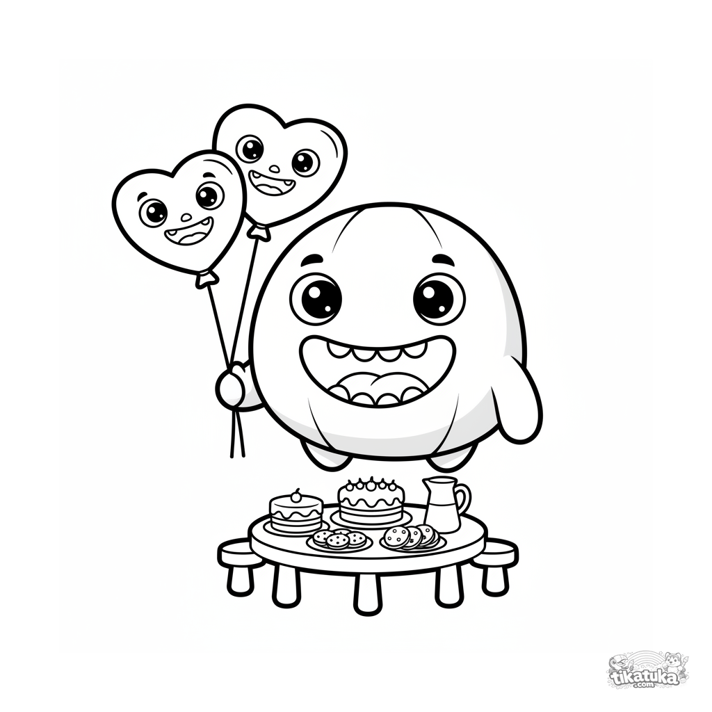 Sehr einfaches Ausmalbild für Kleinkinder 2-3: Ein schwebendes Wolken-Monster hält die Schnüre von drei herzförmigen Luftballons auf einem Picknick. Große, klare Formen, perfekt für erste Buntstifte.