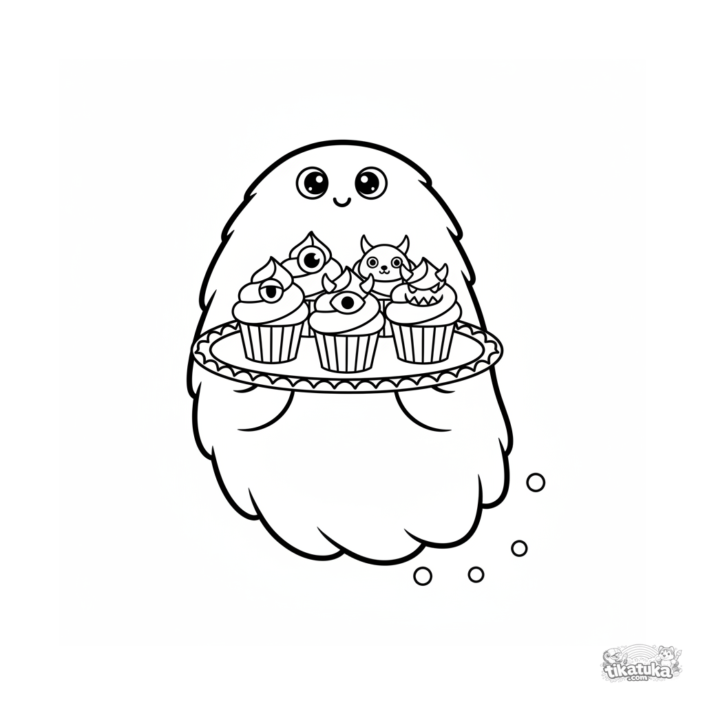 Sehr einfaches Ausmalbild für Kleinkinder 2-3: Ein schwebendes, wolkenartiges Monster trägt ein Tablett mit Muffins über einem Picknick. Minimalistische Szene mit großen Formen.
