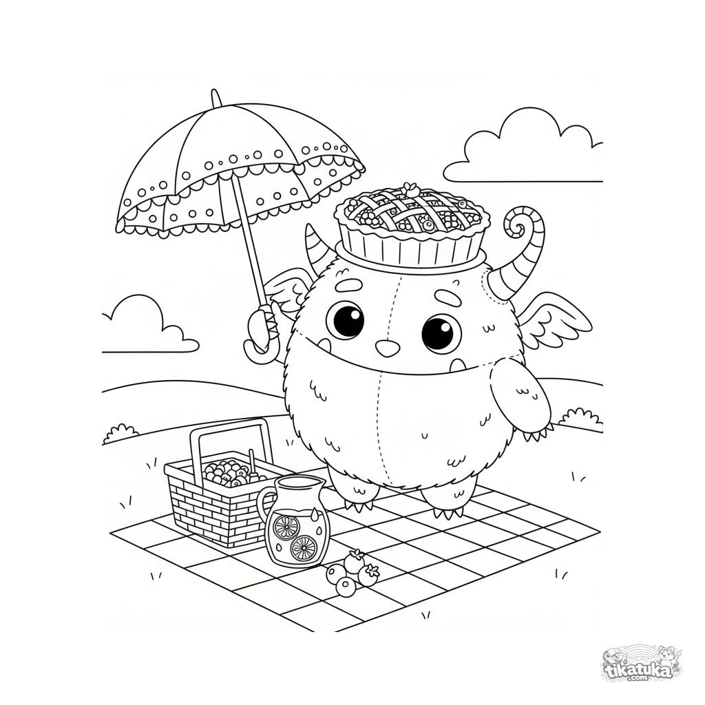 Ausmalbild für Kinder 4-6: Ein niedliches, schwebendes Monster mit Regenschirm trägt vorsichtig eine Beerentorte zum Picknick. Magische Szene.