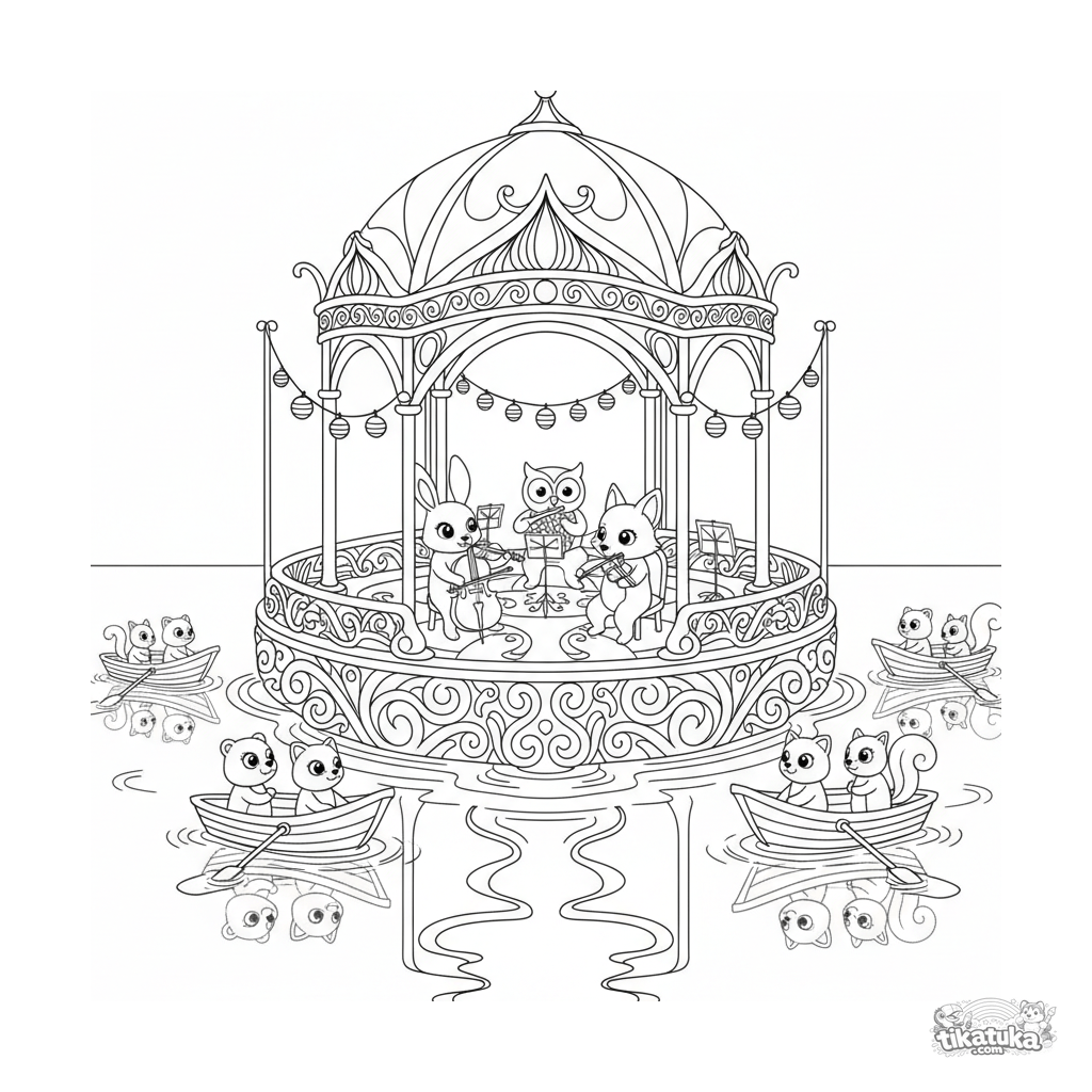 Ausmalbild für 10-12 Jahre: ein eleganter schwimmender Musikpavillon auf einer Meeresplattform. Szene mit Orchester, Zuhörern in Ruderbooten, Laternen und Abendmeer.