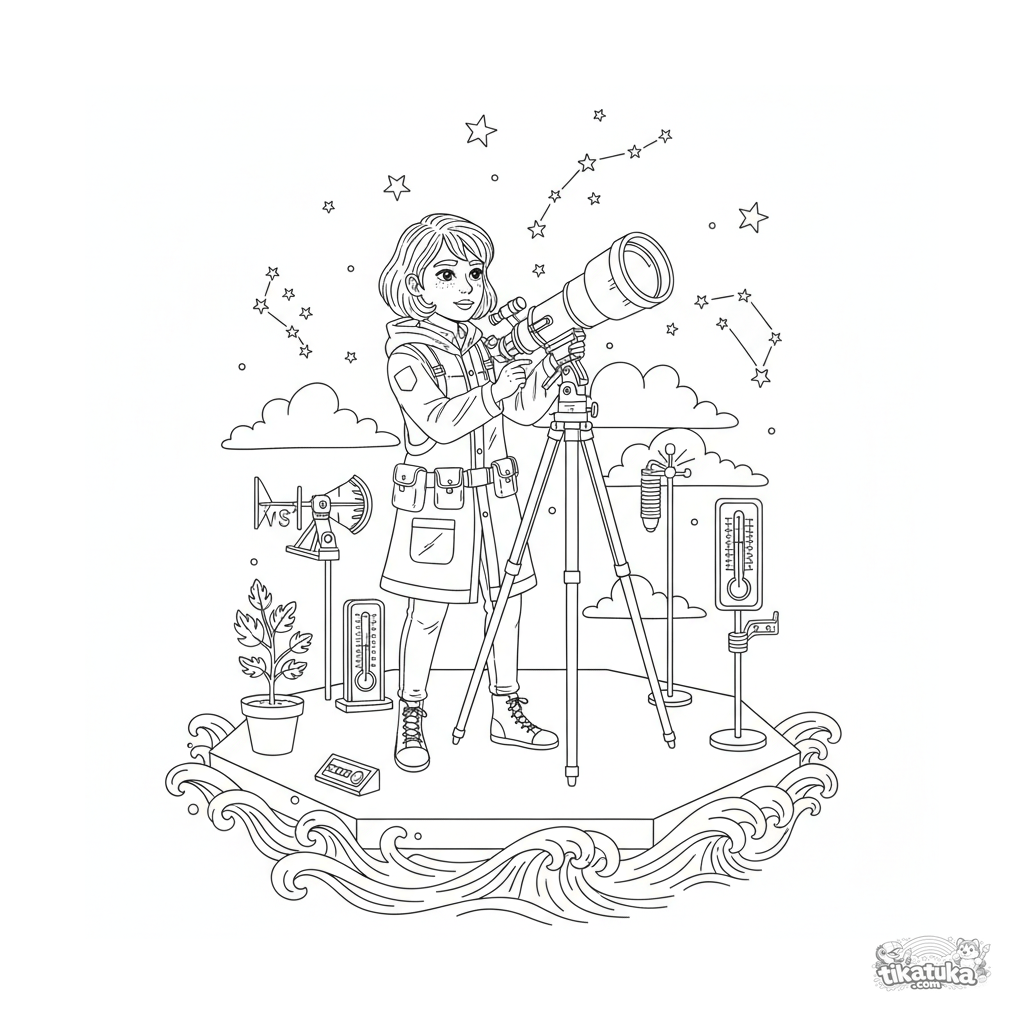 Ausmalbild für 10-12 Jahre: Ein Wissenschaftler auf einer schwimmenden Plattform im Meer stellt ein Teleskop ein. Komplexe Szene mit Instrumenten und Wellen.