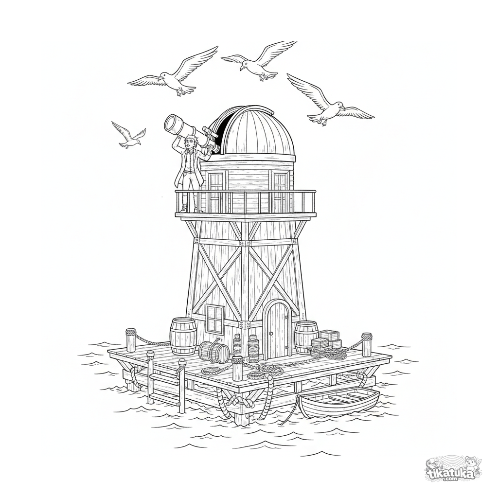 Ausmalbild für 10-12 Jahre: eine detaillierte schwimmende Meeressternwarte mit Teleskop auf einer Holzplattform. Komplexe Szene mit Wissenschaftler, Seevögeln und maritimen Details.