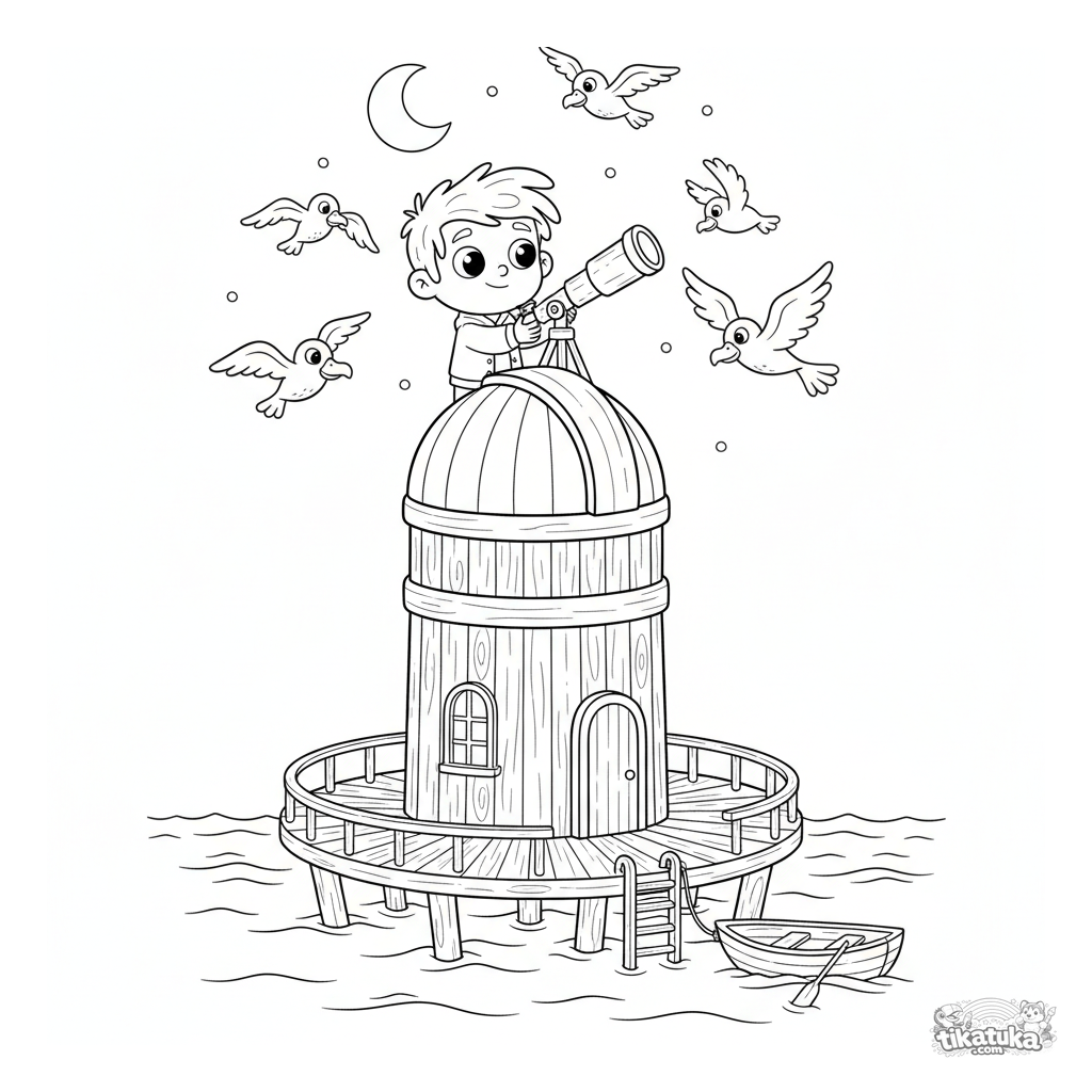 Ausmalbild für 10-12 Jahre: Eine schwimmende Meeressternwarte mit Teleskop. Detaillierte Szene mit Astronom, Vögeln und Ruderboot zum kreativen Ausmalen.