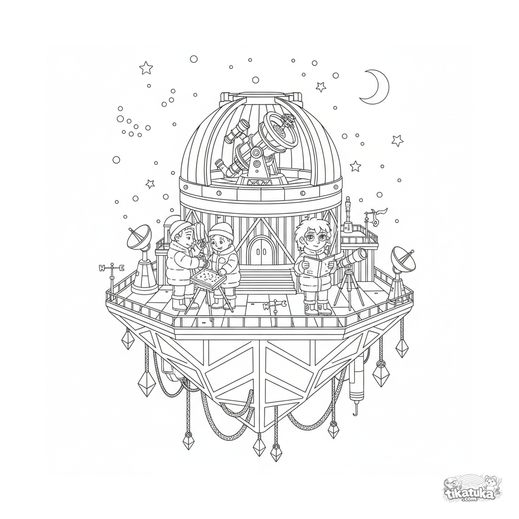 Komplexes Ausmalbild für Kinder 10-12: ein detailliertes schwimmendes Observatorium mit Teleskopen auf einer mehrstufigen Plattform auf offener See. Astronomen, Sternkarten, Ausrüstung.