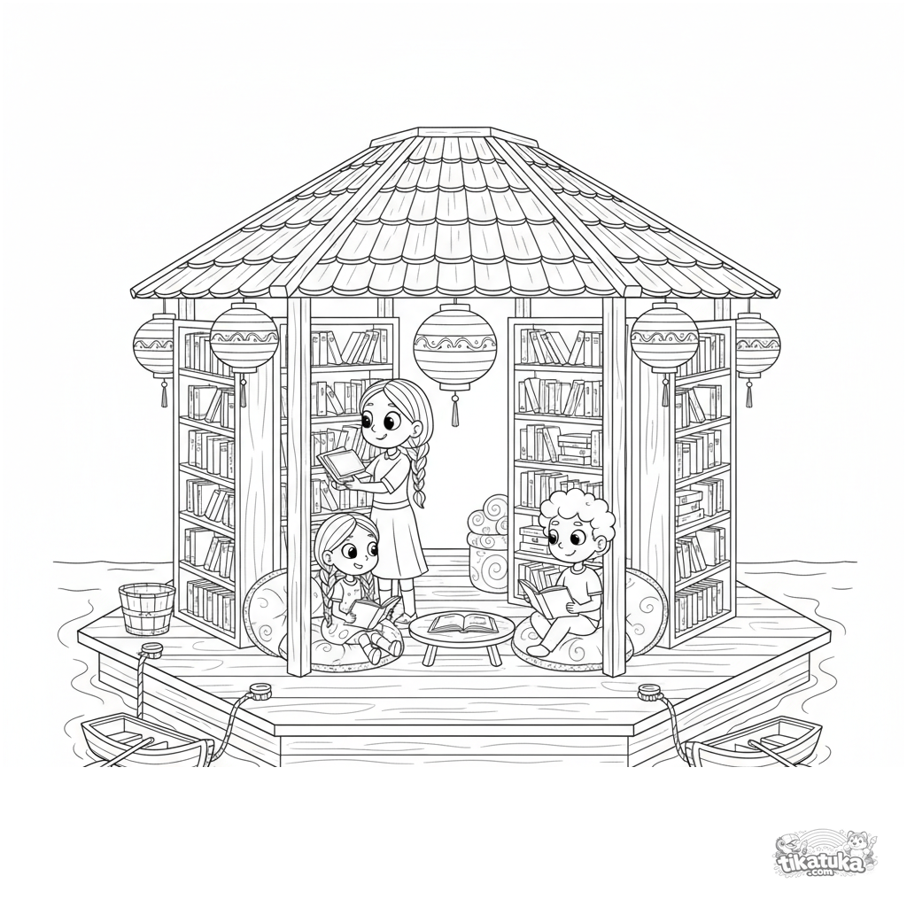 Detailliertes Ausmalbild für Kinder 10-12: eine gemütliche schwimmende Bibliothek auf einer sechseckigen Plattform in einer ruhigen Bucht. Bücherregale, Leser, Bibliothekarin und dekorative Laternen.