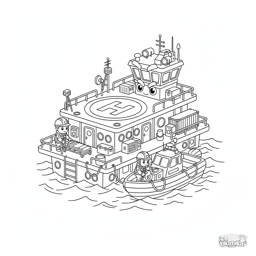 Ausmalbild für Kinder 10-12: eine robuste schwimmende Rettungsstation mit Helikopterlandeplatz und Schnellboot auf rauer See. Rettungskräfte bereiten Ausrüstung in einer detaillierten Actionszene vor.