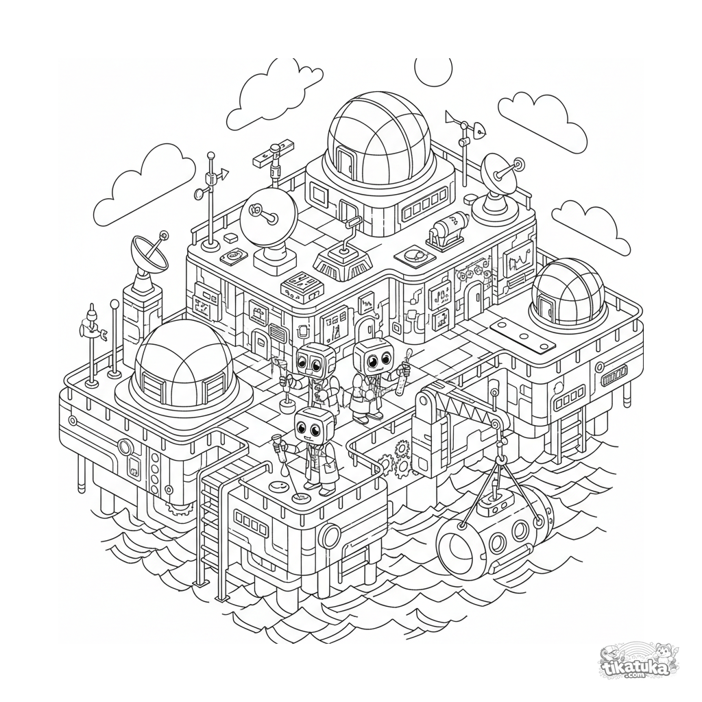 Technisches Ausmalbild einer futuristischen schwimmenden Forschungsstation für 10-12 Jahre. Viele Details: Fahrzeuge, Instrumente, Wissenschaftler bei der Arbeit.