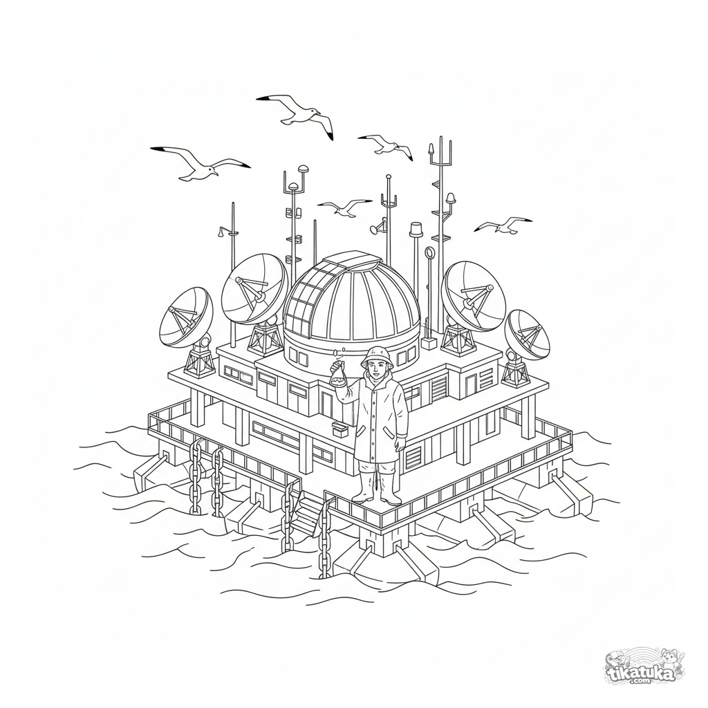 Ausmalbild für Kinder 10-12: eine detaillierte schwimmende Meeresforschungsplattform mit Observatorium, Satellitenschüsseln und einem Wissenschaftler. Komplexe Szene zum kreativen Ausmalen.