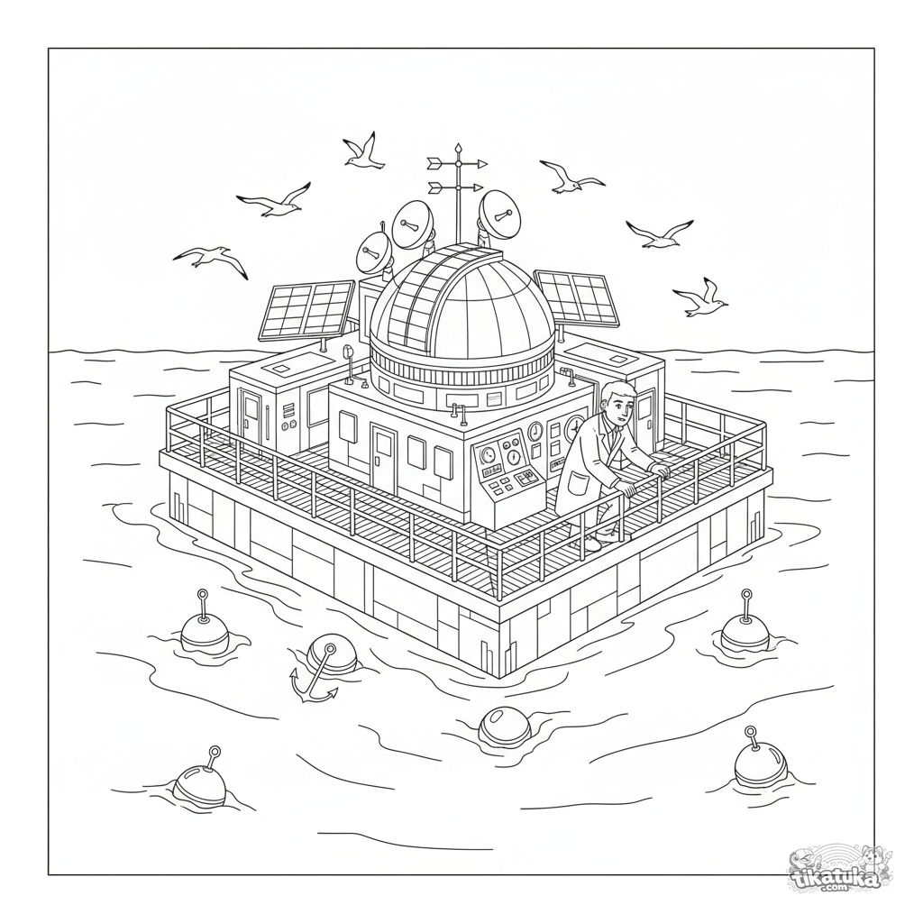 Ausmalbild für 10-12 Jahre: eine detaillierte schwimmende Meeresforschungsplattform mit Observatoriumskuppel, Satellitenschüsseln und einem Wissenschaftler an Deck.