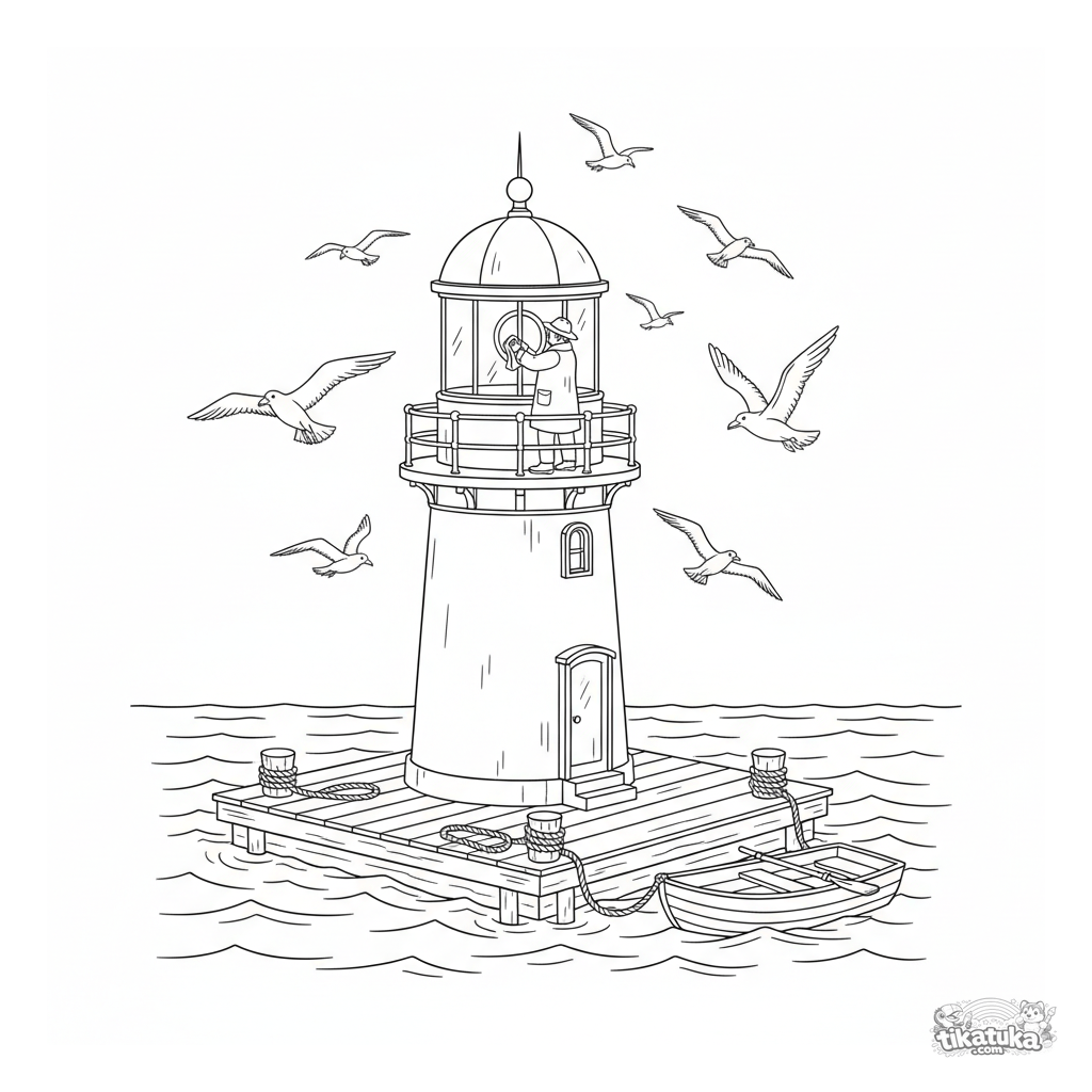 Detailliertes Ausmalbild eines schwimmenden Leuchtturms auf einer Meeresplattform für 10-12 Jahre. Zeigt einen Wärter, Seevögel und nautische Details.