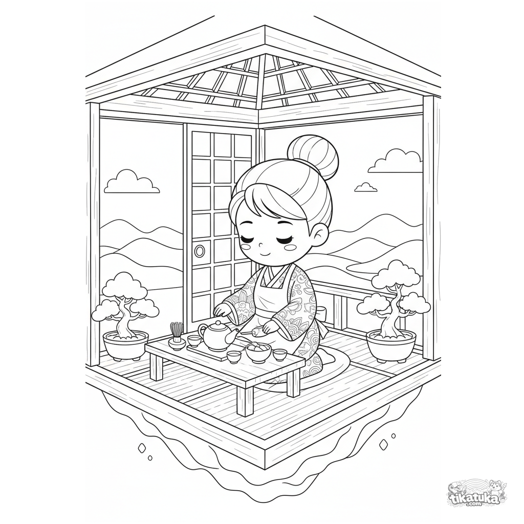 Ausmalbild für 10-12 Jahre: Ein Bedienender bereitet eine Teezeremonie in einem schwimmenden Teehaus im japanischen Stil vor, mit Tatami-Matten, Bonsai-Bäumen und Meerblick.