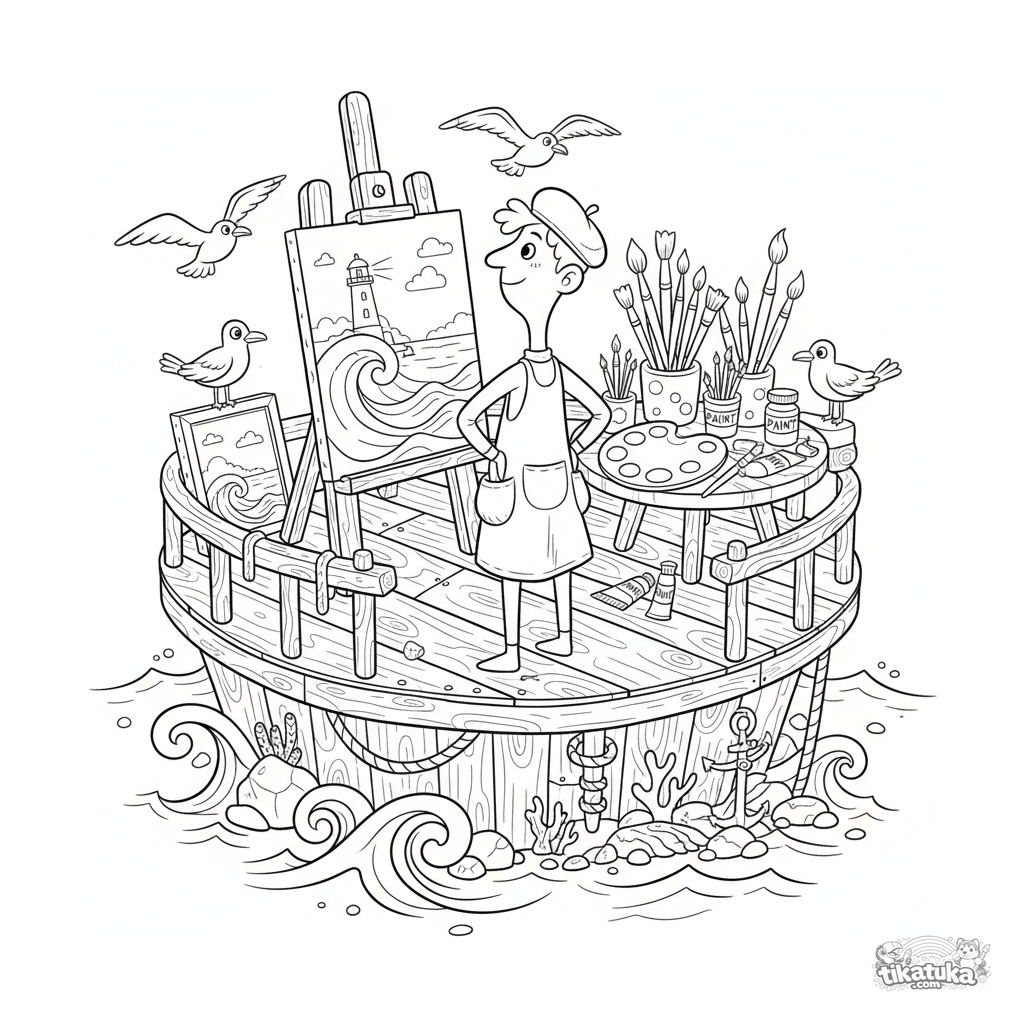 Ausmalbild einer schwimmenden Künstlerwerkstatt auf dem Meer für 10-12 Jahre. Detaillierte Szene mit einer Staffelei, Farben und Leinwänden.