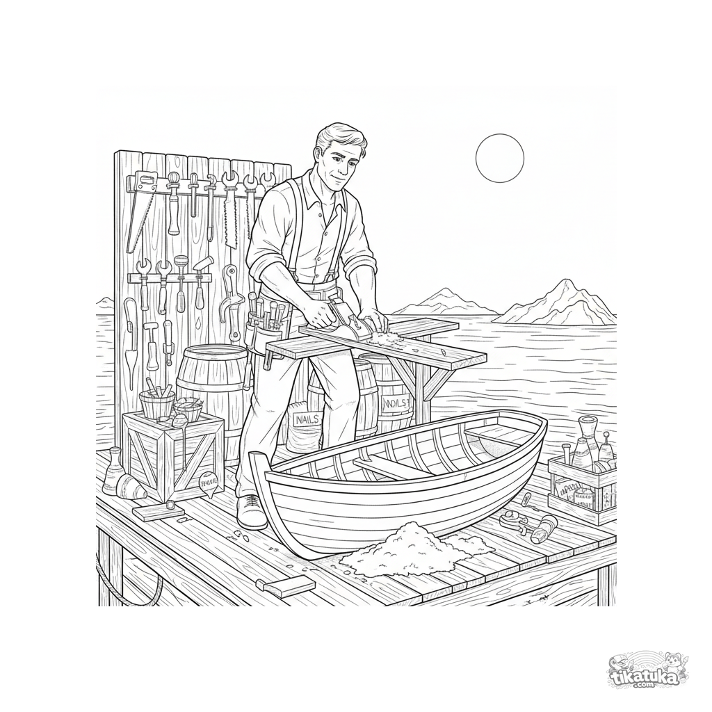 Detailliertes Ausmalbild für 10-12 Jahre: Ein Zimmermann baut ein kleines Boot auf einer schwimmenden Werkstattplattform auf dem Meer, umgeben von Werkzeugen, Sägespänen und Fässern.