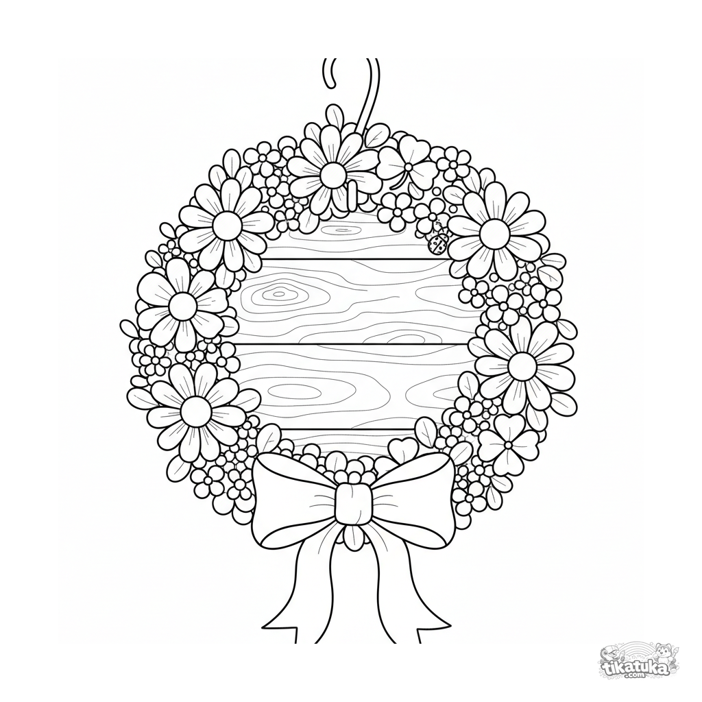 Ausmalbild für Kinder 4-6. Ein runder Wildblumenkranz mit Schleife hängt an einem Haken. Kräftiger Volkskunststil, flache Formen, klare Umrisse.