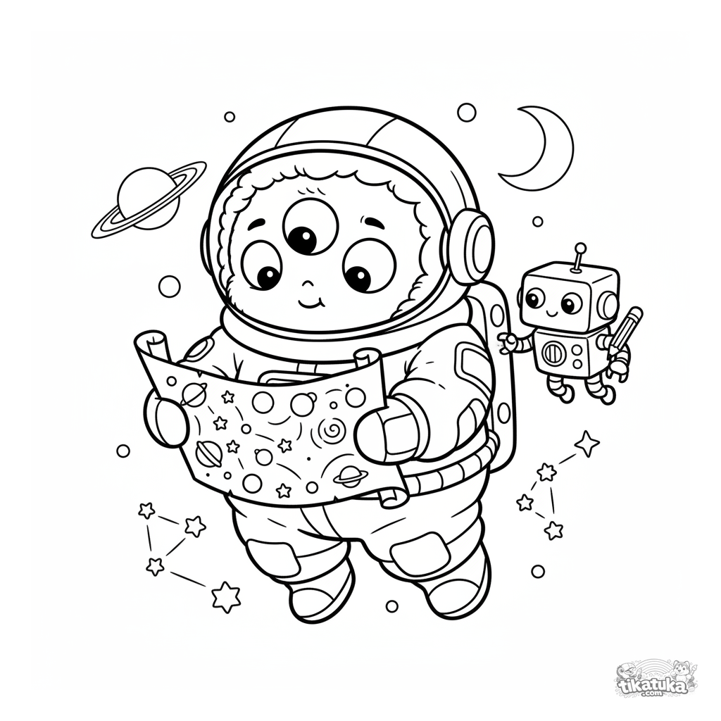 Ausmalbild für Kinder von 4-6 Jahren: Ein flauschiger Alien-Astronaut studiert eine Sternenkarte im Weltraum mit einem Roboter-Begleiter.