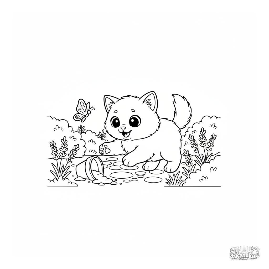 Ausmalbild eines flauschigen Kätzchens, das einem Schmetterling im duftenden Kräutergarten nachjagt. Perfekt für Kinder von 3 bis 6 Jahren.