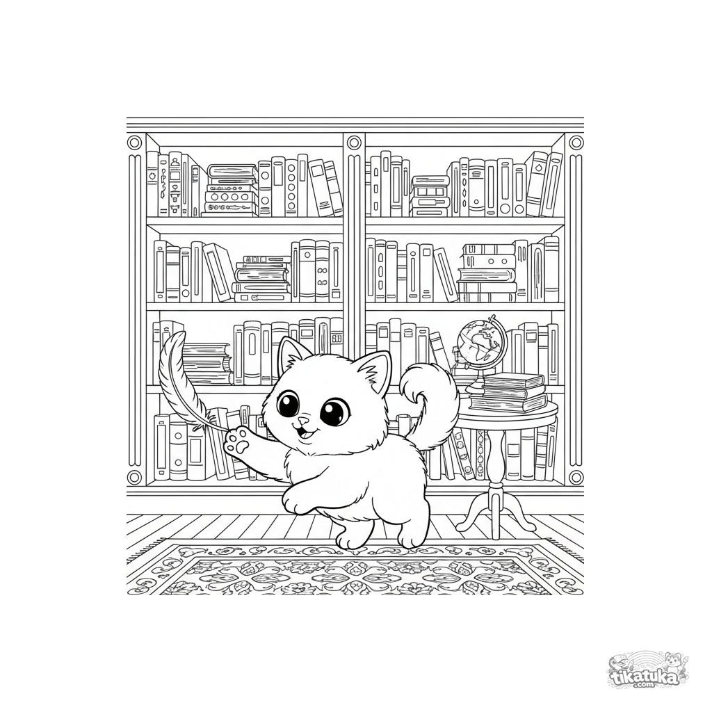 Ausmalbild eines süßen Birma-Kätzchens, das mit einer Feder in einer viktorianischen Bibliothek spielt. Für Kinder von 3-6 Jahren.