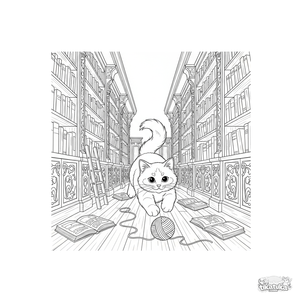 Ausmalbild eines flauschigen Birma-Kätzchens, das einem Wollknäuel in einer viktorianischen Bibliothek nachjagt. Für Kinder von 6-9 Jahren.