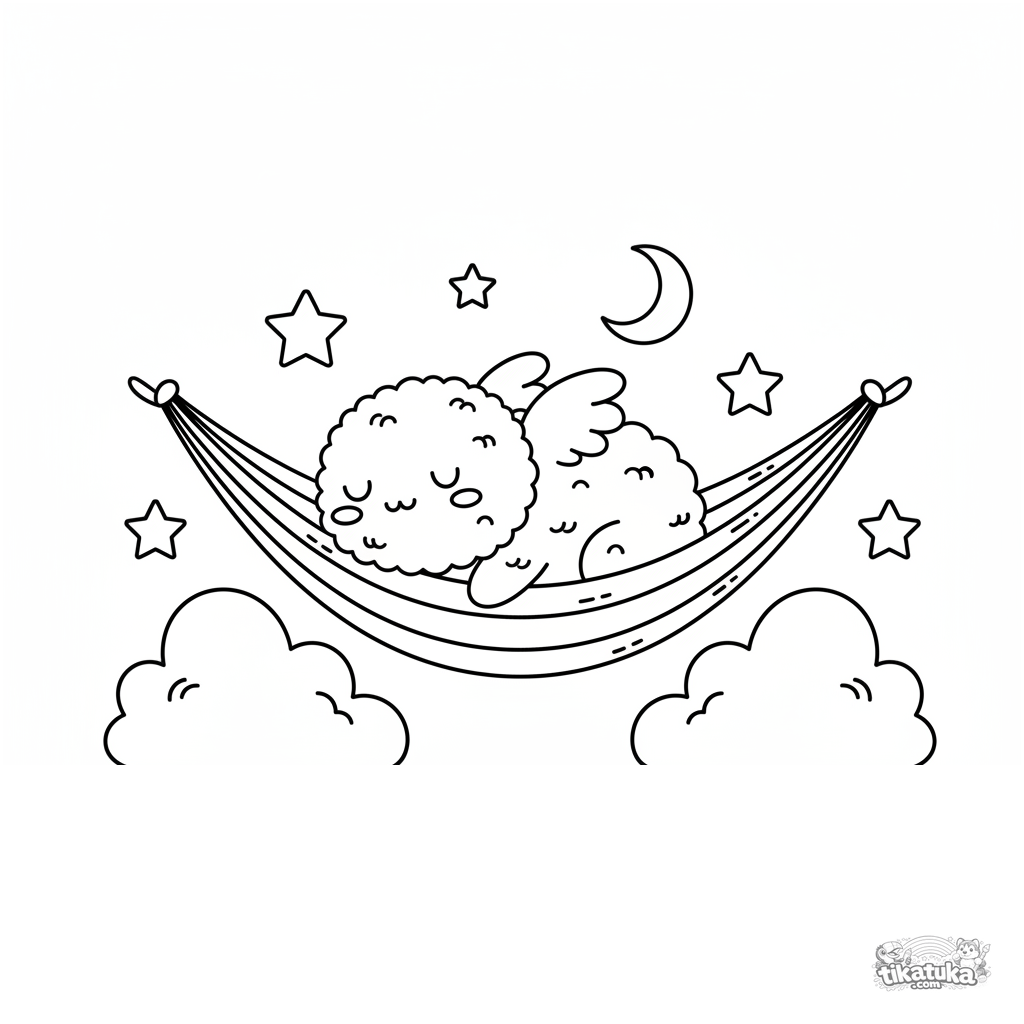 Ausmalbild eines freundlichen, flauschigen Wolkenmonsters, das auf einem Regenbogen schläft. Für Kinder von 3 bis 6 Jahren.