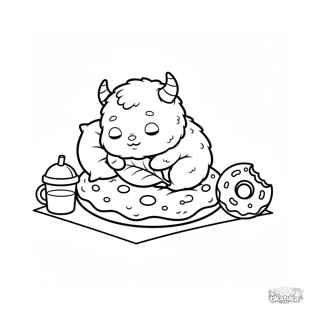 Einfaches Ausmalbild für Kleinkinder 2-3 Jahre: ein flauschiges Monster-Baby schläft auf einem großen Keks beim Picknick. Große Formen, wenig Details.