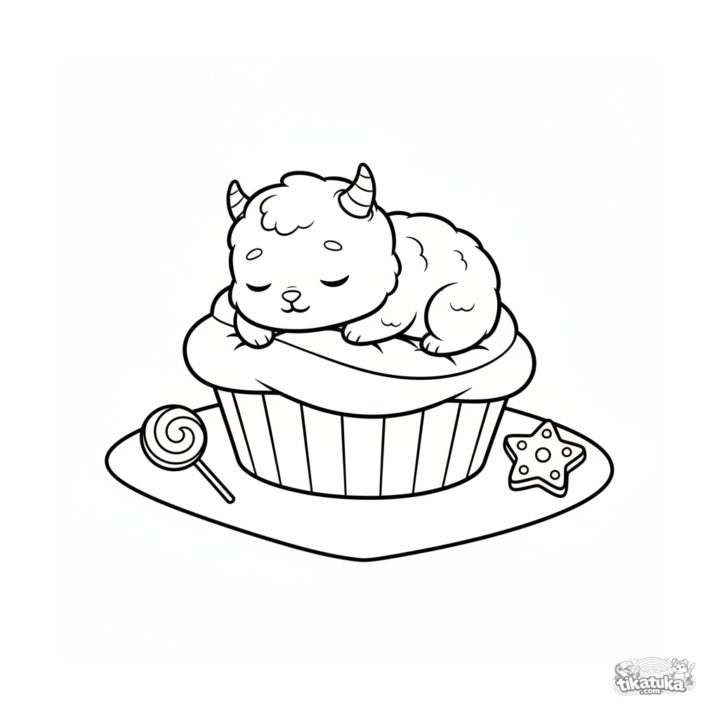 Einfaches Ausmalbild für Kleinkinder 2-3 Jahre: ein flauschiges Monster-Baby schläft auf einem riesigen Cupcake-Kissen bei einem Picknick. Große Formen, wenige Details.