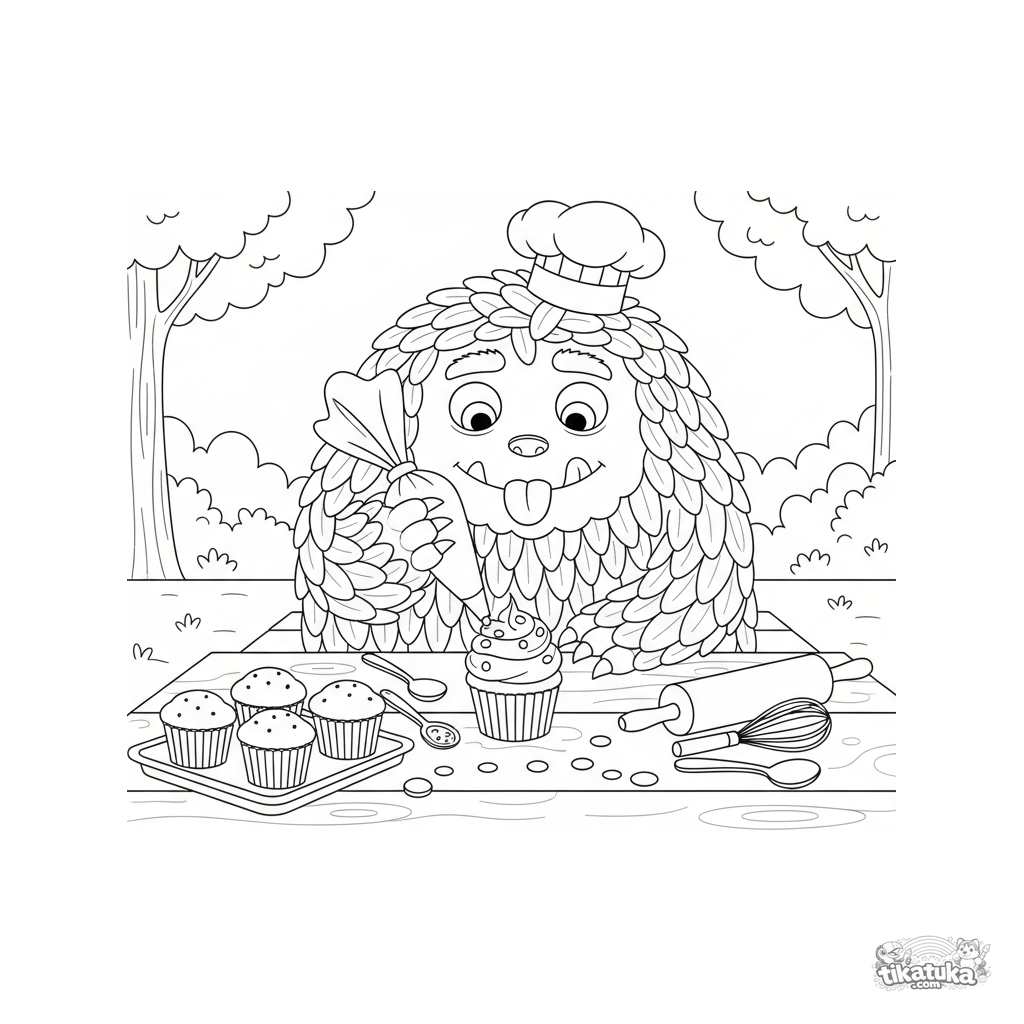 Detailliertes Ausmalbild für ältere Kinder 10-12: Ein flauschiges Monster mit Kochmütze dekoriert auf einem Picknick akribisch einen Cupcake. Viele Details: Werkzeuge, Streusel, Texturen.