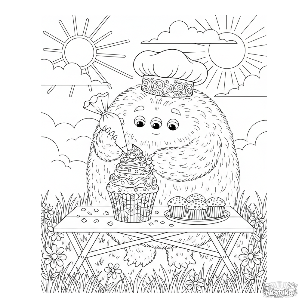 Detailliertes Ausmalbild für Kinder von 10-12 Jahren: ein flauschiges Monster als Konditor, das einen Cupcake beim Picknick verziert.