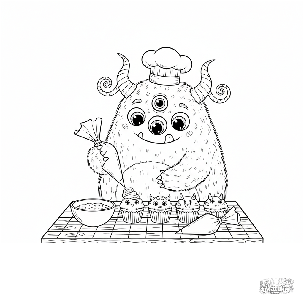 Detailliertes Ausmalbild für Kinder 10-12 Jahre: ein flauschiges Monster mit einer Konditormütze verziert Cupcakes auf einem Picknick.
