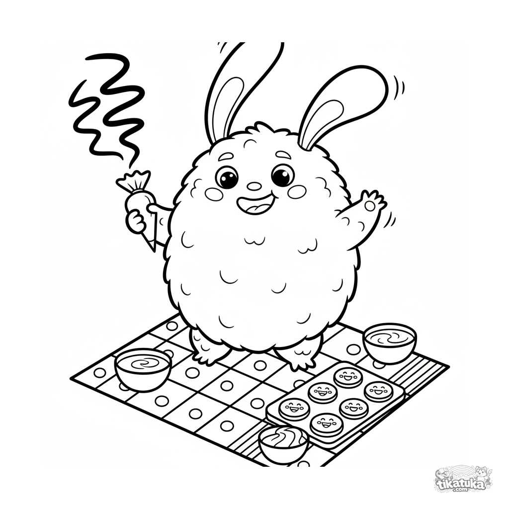 Sehr einfaches Ausmalbild für Kleinkinder 2-3: Ein flauschiges Monster tanzt glücklich mit einem Spritzbeutel beim Picknick. Große freie Flächen zum Ausmalen.