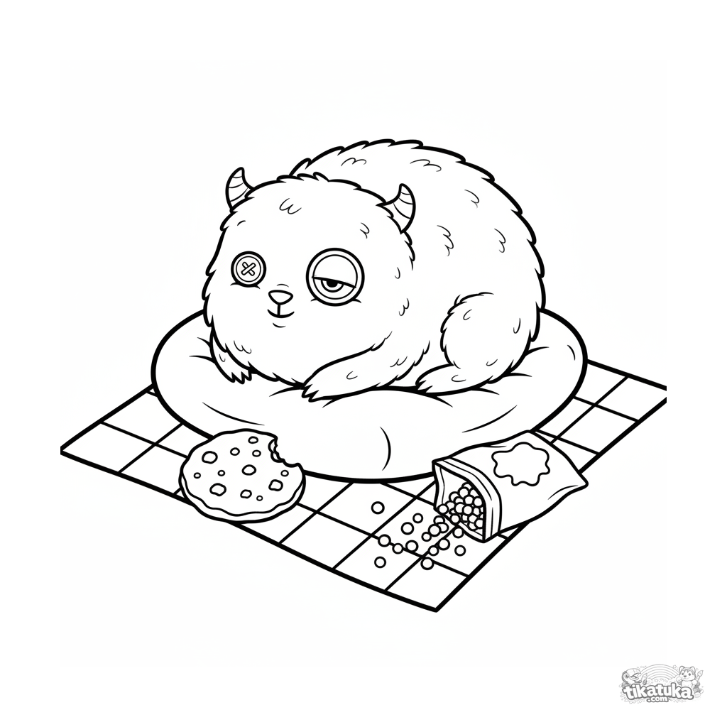 Kleinkind-Ausmalbild 2-3: Ein flauschiges Monster nickert auf einem Marshmallow-Kissen nach einem Picknick. Einfache, große Formen.
