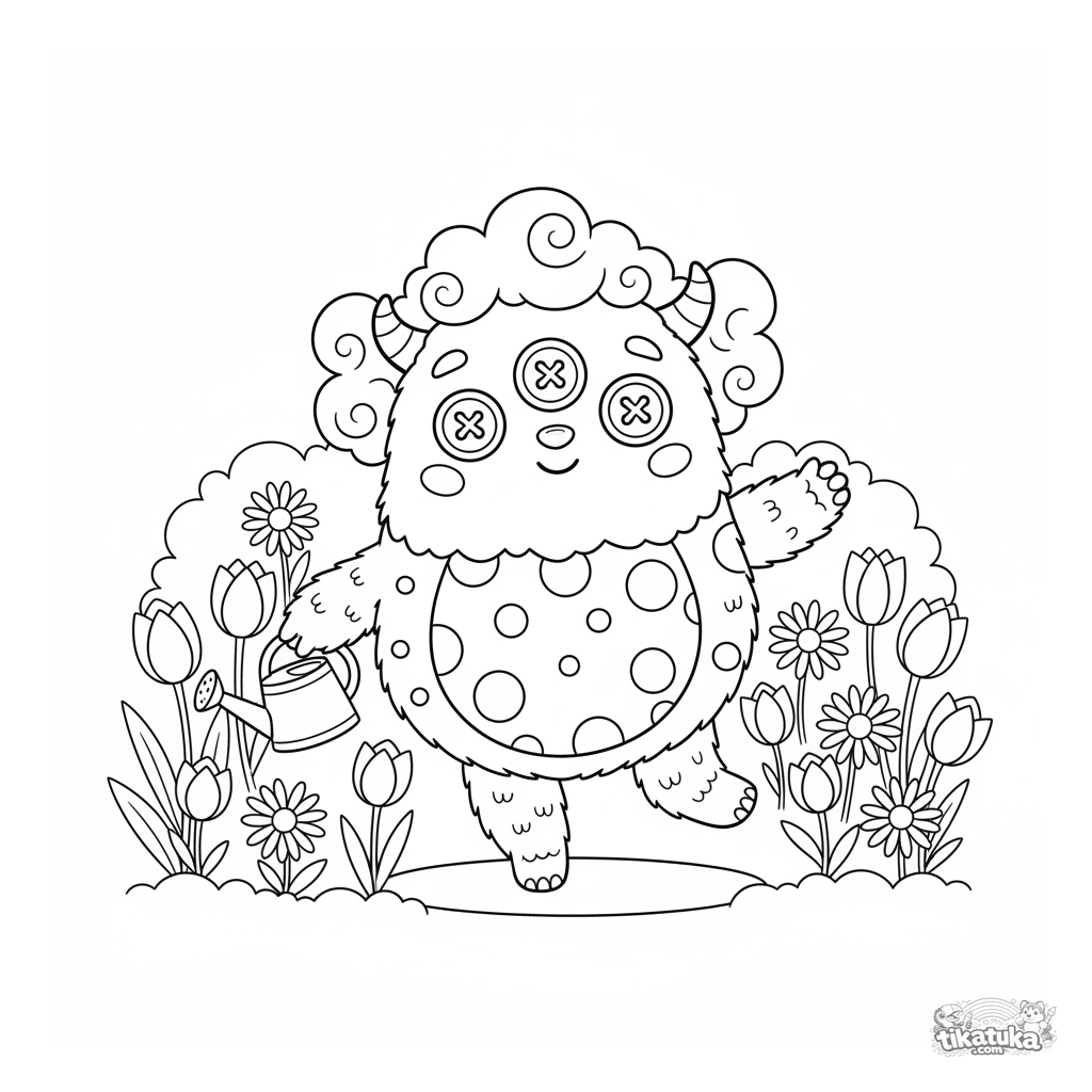 Ausmalbild für Kinder 4-6: Ein flauschiges Monster mit drei Augen tanzt fröhlich mit einer Gießkanne im Blumengarten.